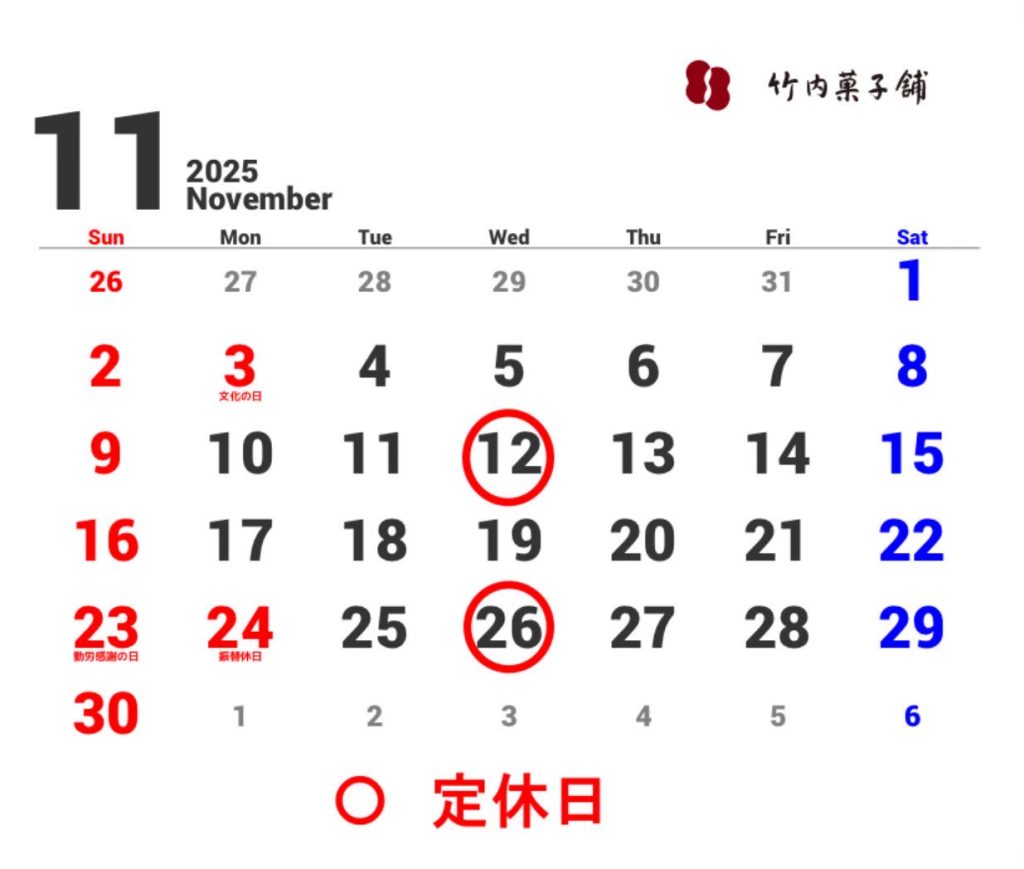 今月はいい夫婦の日と勤労感謝の日があることから、竹内菓子舗では「ありがとう月間」とさせていただいており、またイベントも企画中です。