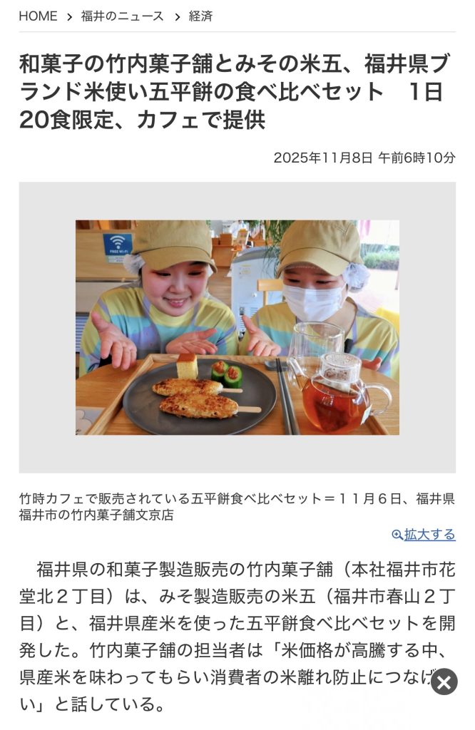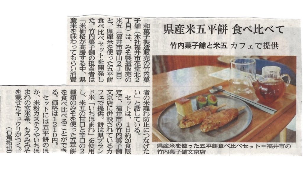 先日ご紹介した米五の味噌さんとのコラボ商品「五平餅食べ比べセット」が福井新聞さんに取材されましたのでご紹介します。