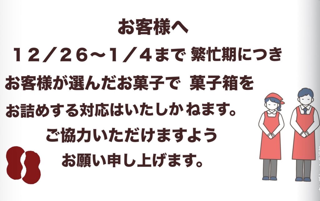 あと勝手ではありますが、繁忙期のために12月26日(金)〜1月4日(日)まで、お客様の選んだお菓子での菓子箱対応ができませんので、ご注意ください。