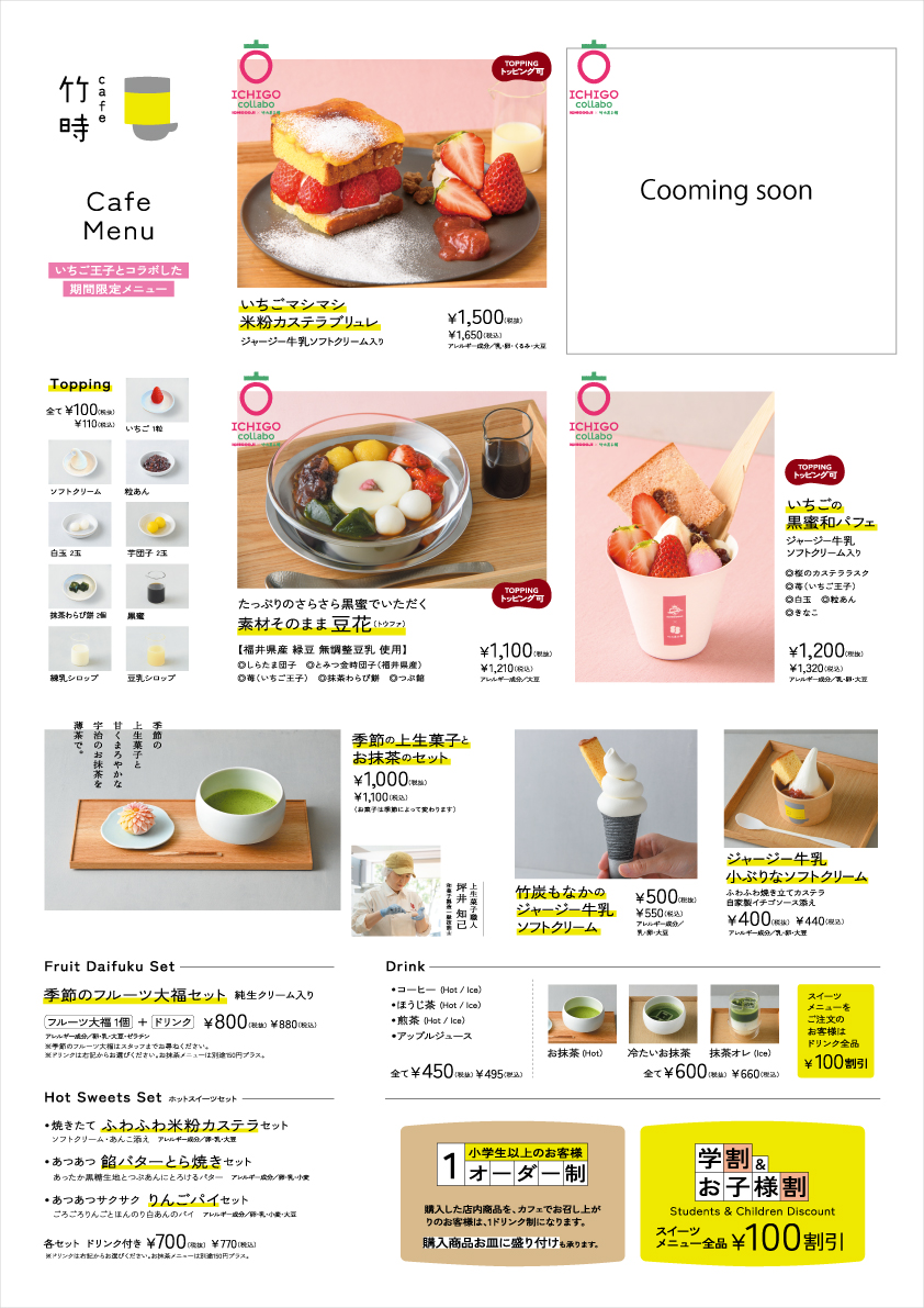 新鮮な苺が手に入ったことにより、竹時カフェのメニューも春らしく一新しました。